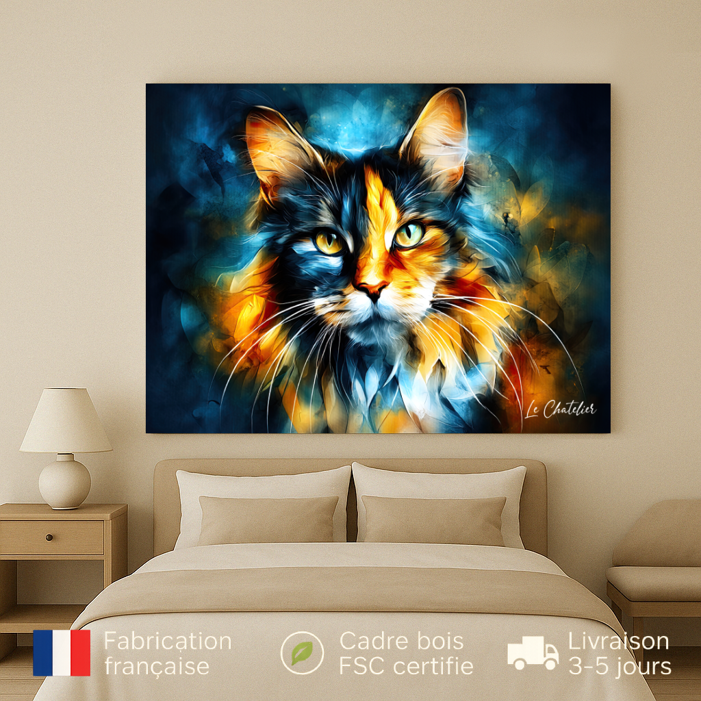 Parce qu’il donne vie au charisme brut d’un félin, plongé dans un tourbillon de bleus profonds et de flammes dorées. Une œuvre vibrante, magnétique, où chaque couleur semble porter une énergie sacrée. Pour celles qui veulent affirmer leur intérieur, avec force, audace… et mystère.