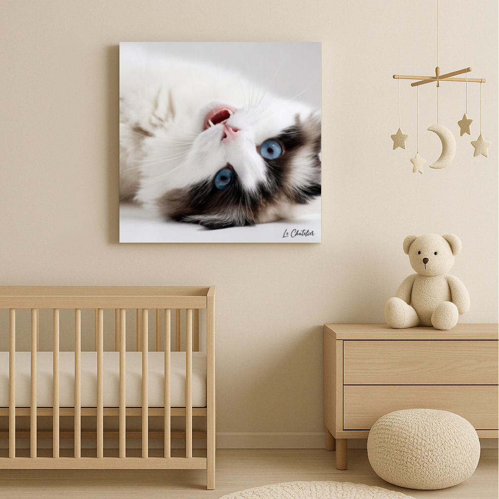 Parce qu’il renverse tout — l’angle, les codes, le cœur. Ce chat aux yeux bleu glacier et à la posture désinvolte semble vous dire : « J’ai tout vu, et je suis encore plus beau à l’envers. »
