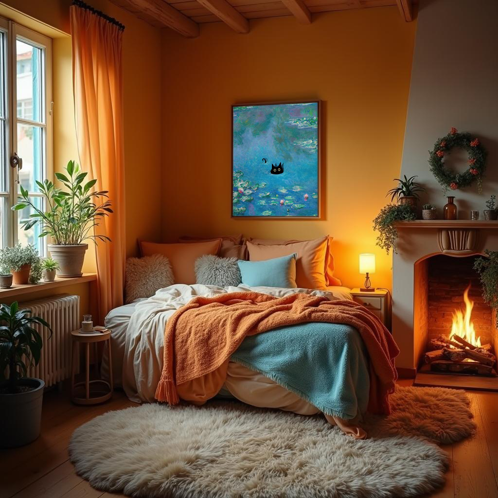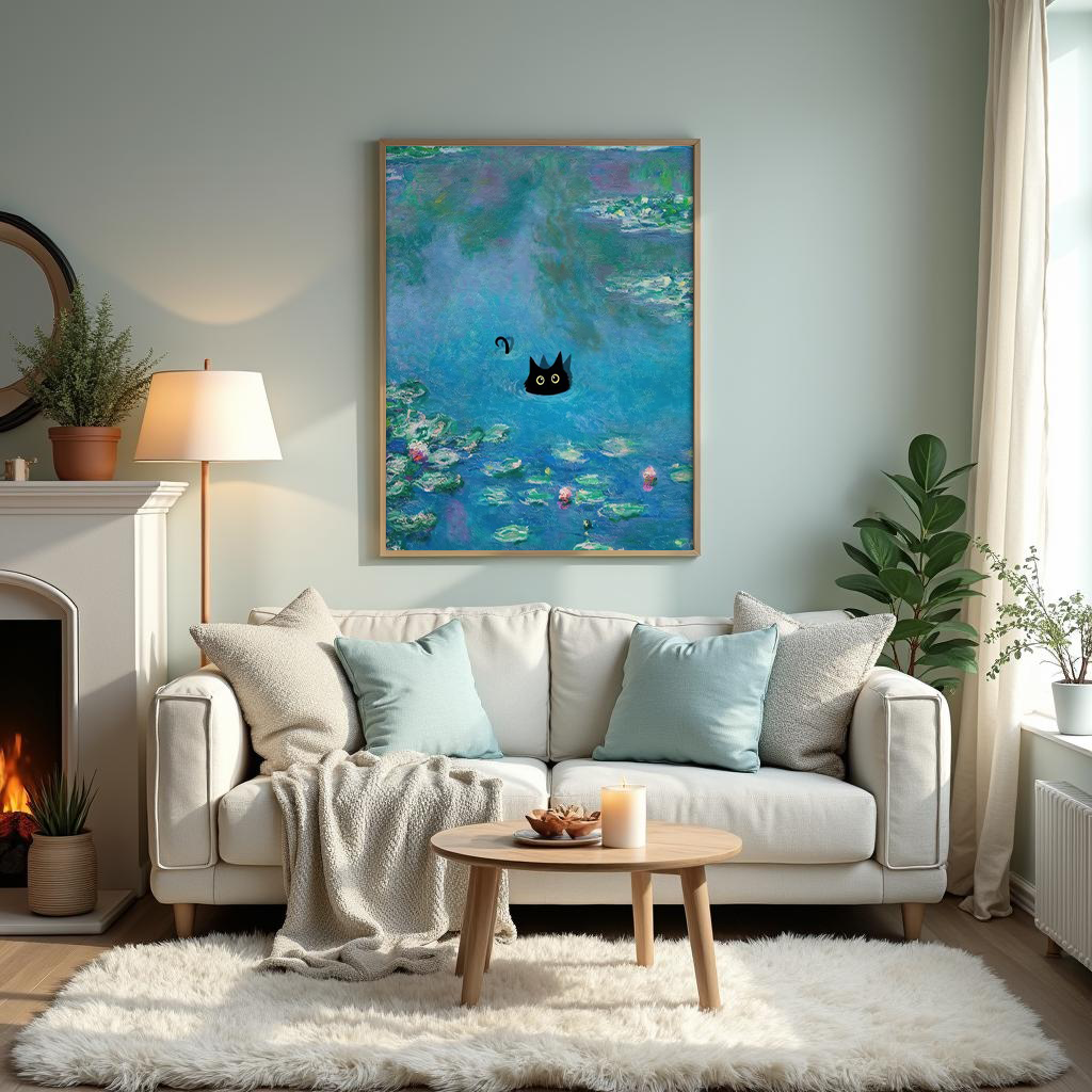 Sous le pinceau impressionniste de Monet, l’eau frissonne et reflète mille nuances de bleu et de vert. Entre les nymphéas flottants, un petit museau noir perce la surface, accompagné d’une queue espiègle qui danse au rythme des ondulations.