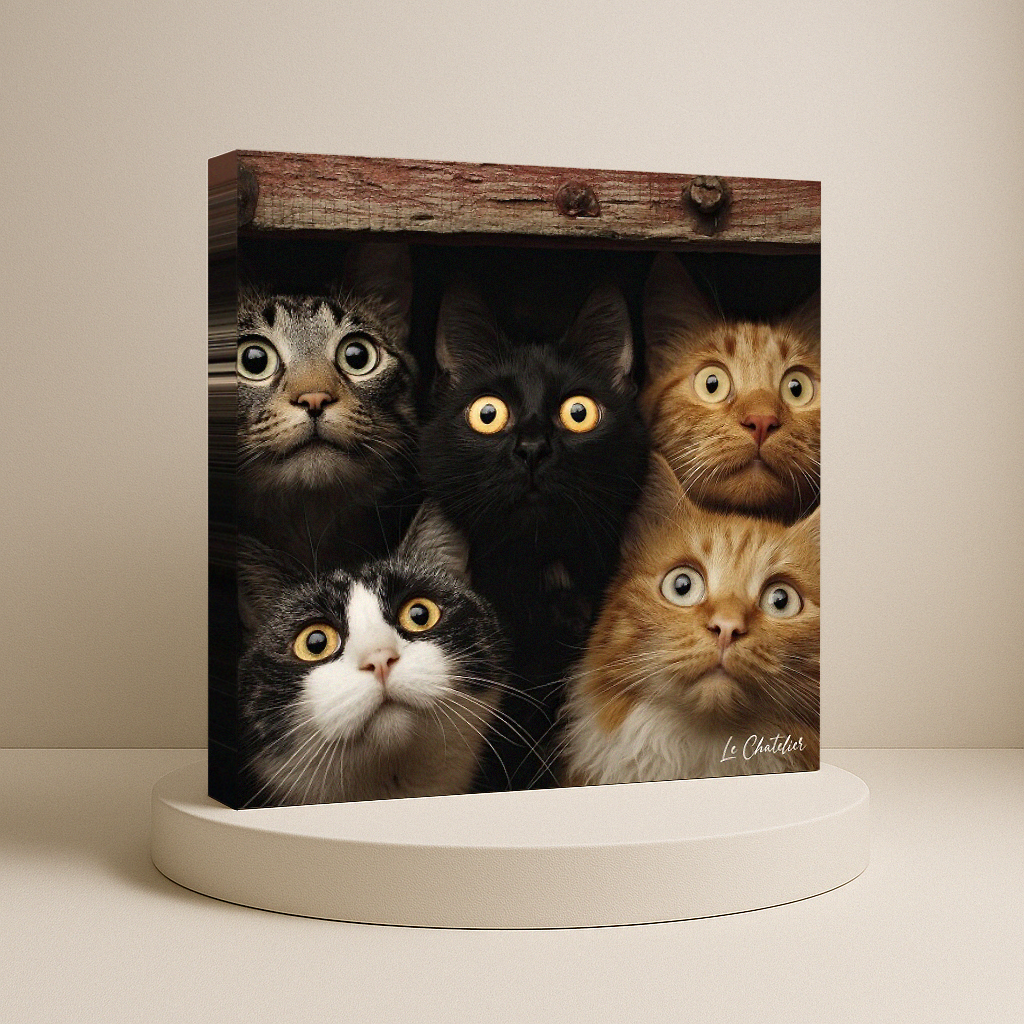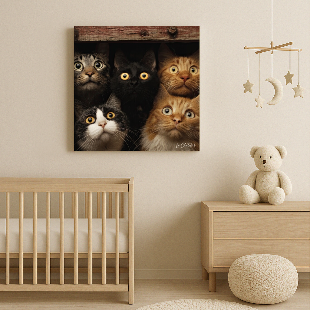 Parce qu’il réunit cinq regards perçants, chacun unique, tous tournés vers vous. Un instant de stupeur partagée, figé dans une composition aussi drôle que captivante. Une œuvre idéale pour celles qui aiment les ambiances vivantes, les chats expressifs… et les tableaux qui créent du lien.